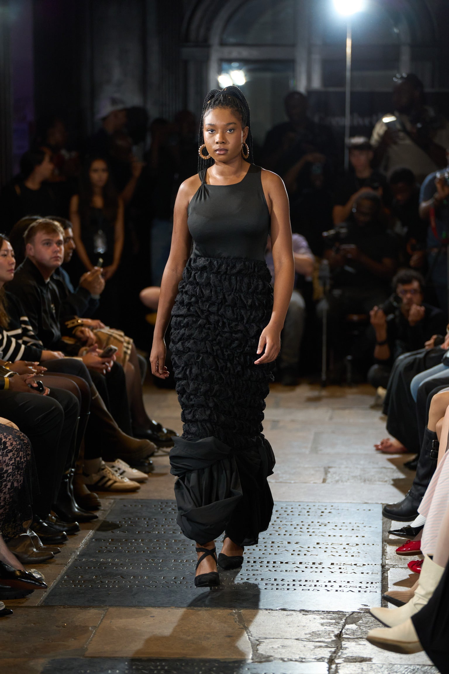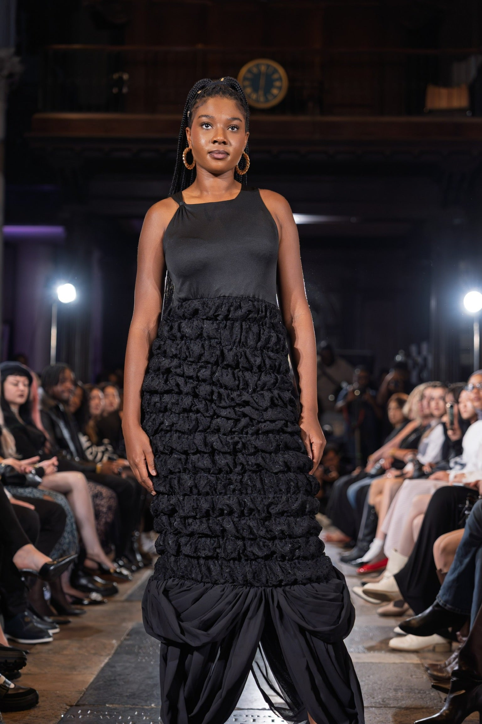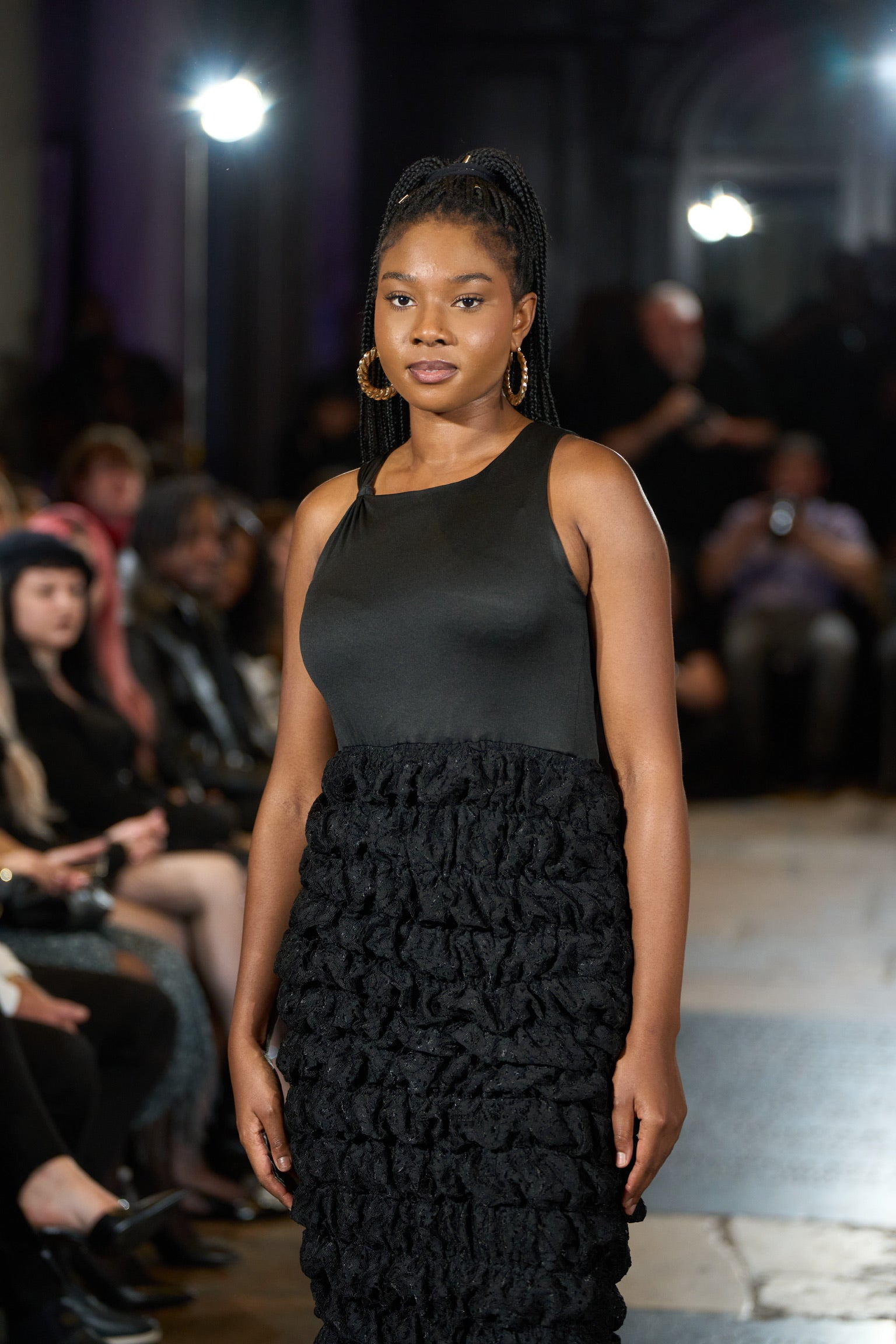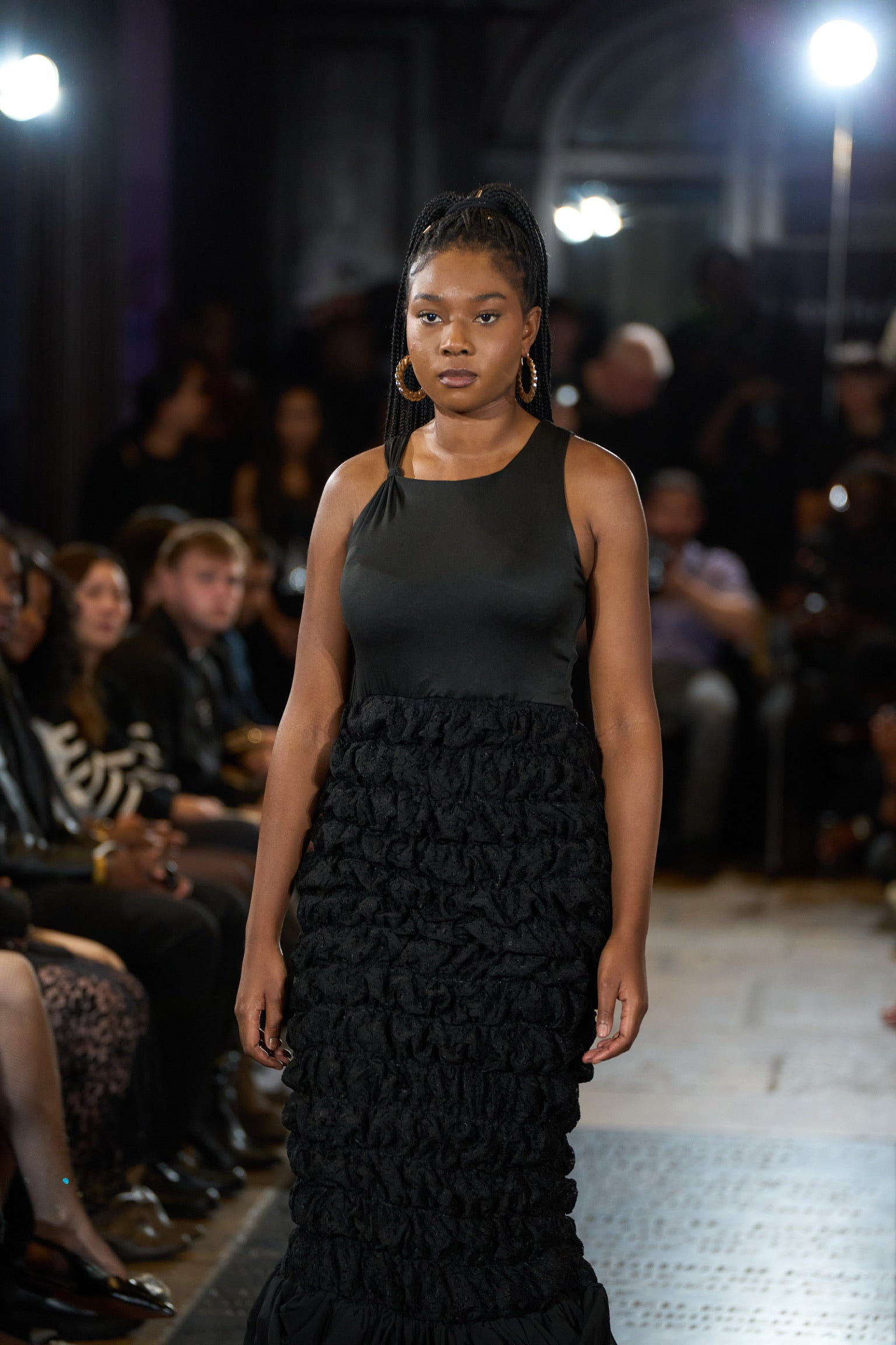 Sculptural and commanding, the Bree dress is a study in texture and form. The sleek, fitted bodice flows into a richly ruched chantily lace skirt, each gathered detail creating depth and dimension. The silhouette tapers into a dramatic knotted hem with a subtle front slit, adding structure and movement in equal measure. Sophisticated yet daring